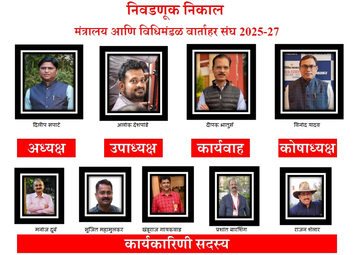 मंत्रालय आणि विधिमंडळ वार्ताहर संघाच्या सर्वसाधारण वार्षिक सभेत सन २०२५-२६ आणि २०२६- २७ अशा दोन वर्षासाठी संघाची कार्यकारिणी निवडण्यात आली. या निवडणुकीत कोषाध्यक्षपदी विनोद यादव (Vinod Yadav) ( दिव्य भास्कर), उपाध्यक्षपदी आलोक देशपांडे (Alok Deshpande) (इंडियन एक्स्प्रेस) निवडून आले. तर कार्यकारिणी सदस्य म्हणून मनोज दुबे ( हमारा महानगर ) सुजित महामुलकर (हिंदुस्थान पोस्ट), खंडूराज गायकवाड (Khanduraj Gaikwad) ( सांज महानगरी), प्रशांत बारसिंग (नवराष्ट्र) आणि राजन शेलार (पुढारी) विजयी झाले आहेत.